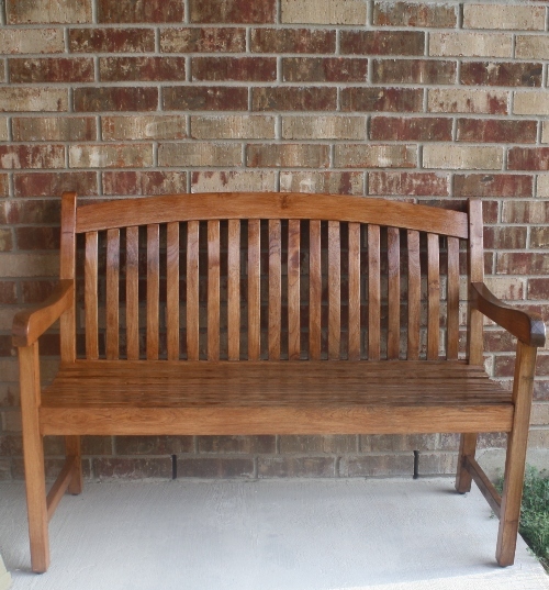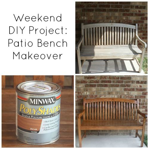 I propped up the bench on two plastic storage bins in the garage, then gave my bench two coats of Minwax Pecan Gloss Polyshades Stain. Since it's both stain and sealer in one step, the project goes much faster. I did one coat on Saturday and another on Sunday, then carried it back out to my front patio. Each coat took me about one hour. I did absolutely no sanding before staining. The difference is incredible!