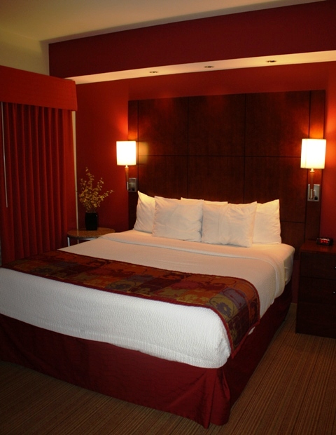 Residence Inn. This one-bedroom suite "hotel room" was far from just a room. It was more like an apartment and I remarked several times over the weekend to my husband that I could live there comfortably. Just look at that beautiful, serene bedroom!