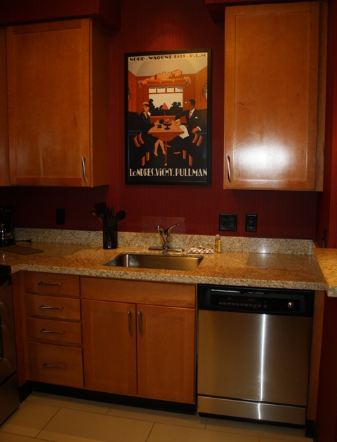 The decor in the room is simply gorgeous. I love the color theme and how it resonated through the entire apartment. Everything was made of high quality building materials like wood cabinets, tile floors, and granite counters. Seriously, I could live here!