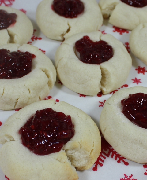 The Shortbread mix felt dry when I first started working it, but I used my hands to knead it well and the dough came together beautifully. I used a wooden cookie press to make the raspberry jam indentations after they came out of the oven. They are simply beautiful and very tasty!