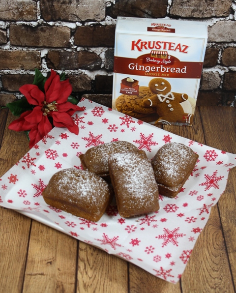 I noticed the Gingerbread Cake recipe on the back of the box, so I decided to make little gingerbread cakes with my eight-loaf pan. I got eight delightfully fluffy cakes from one box. I dusted each one with sifted powdered sugar and they are ready for gift-giving!