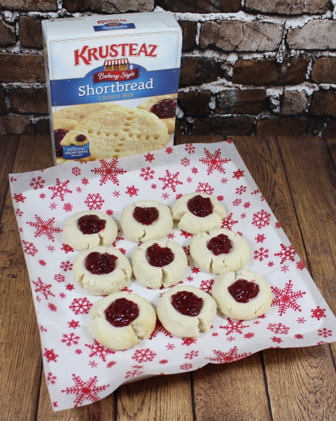 Next, I used the Shortbread Cookie Mix to make Raspberry Thumbprint Cookies. I added one stick of butter to the cookie mix and the raspberry jam after they cooled. The Krusteaz box says it will make about 3 dozen shortbread cookies, but I used larger cookie balls to make them thicker because I love shortbread so I got about 2 dozen.