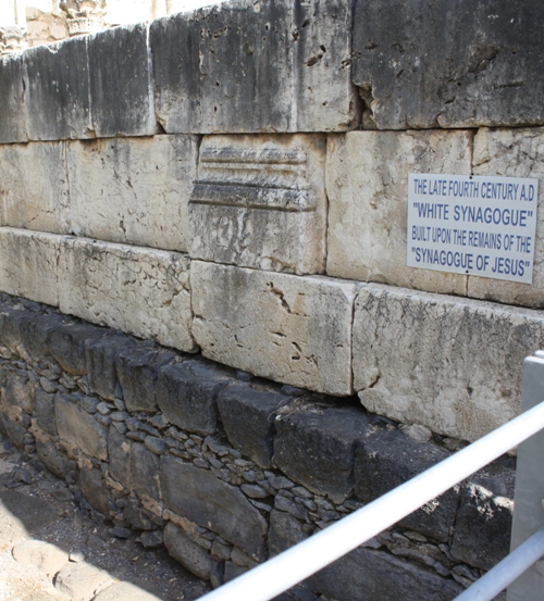 The foundation of the synagogue where Jesus taught was built with black basalt rock, the local rock from which the Capernaum buildings and houses were built during Jesus' time. The white limestone rock was brought in later, during the fourth century.