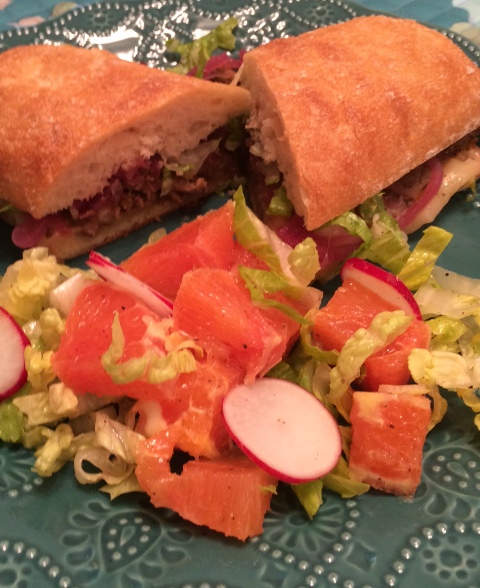 Your delivery includes farm-fresh, seasonal produce, meat with no added hormones, sustainably-sourced seafood, and absolutely everything else you need. My husband is the chef in our family, so I recruited him to prepare these incredible meals. The first one is Spiced Beef and Pickled Onion Tortas with Cara Cara Orange, Radish, and Romaine Salad.