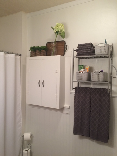 It took four months from start to finish. I painted everything a bright white, using eggshell finish on the upper walls, and semi-gloss finish on the beadboard, trim, and cabinet. I left the original hardware on the cabinet because I like how the metal of the handles has aged. I bought two metal shelves that hold storage baskets and our bathroom towels, which are all shades of gray.
