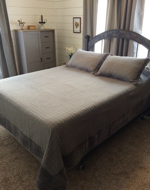 It has taken us two full months to completely renovate our master bedroom. Our little farmhouse has rather small rooms, so it's important to us to make sure each room is beautiful, welcoming, and cozy. I was offered an opportunity to review new bedding from LatestBedding.com and selected the Amrapur Velvet Frame Grey 100% Cotton Quilt Set. No farmhouse is complete without quilts!This bed in a bag set includes a queen size quilt coverlet and two matching standard pillow shams. The set is 100% cotton with a velvet frame around the edges. The cotton and velvet are soft, yet durable, and it feels so cozy to the touch. The quilt is a medium weight quilt, perfect for year round sleeping. I love the way light bounces off the quilt!